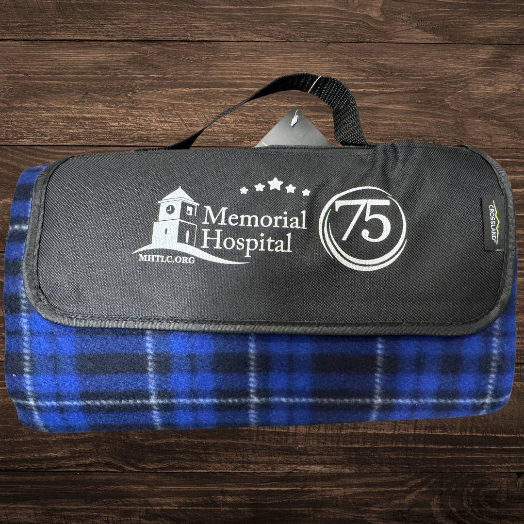 Enhance your outdoor gatherings with the Crossland® Picnic Blanket, exclusively featuring the Memorial Hospital 75th Anniversary logo. This cozy blanket is crafted from soft polyester fleece adorned in a classic blue and black plaid pattern, perfect for any picnic or outdoor event. It’s designed with a practical water-resistant backing to keep you dry on damp surfaces. Conveniently, it folds up into a compact form and is secured by a fabric flap with a built-in pocket and carry handle, making transportation effortless. Celebrate a legacy of care while enjoying the great outdoors. This special edition blanket is available for order online and must be picked up in person*