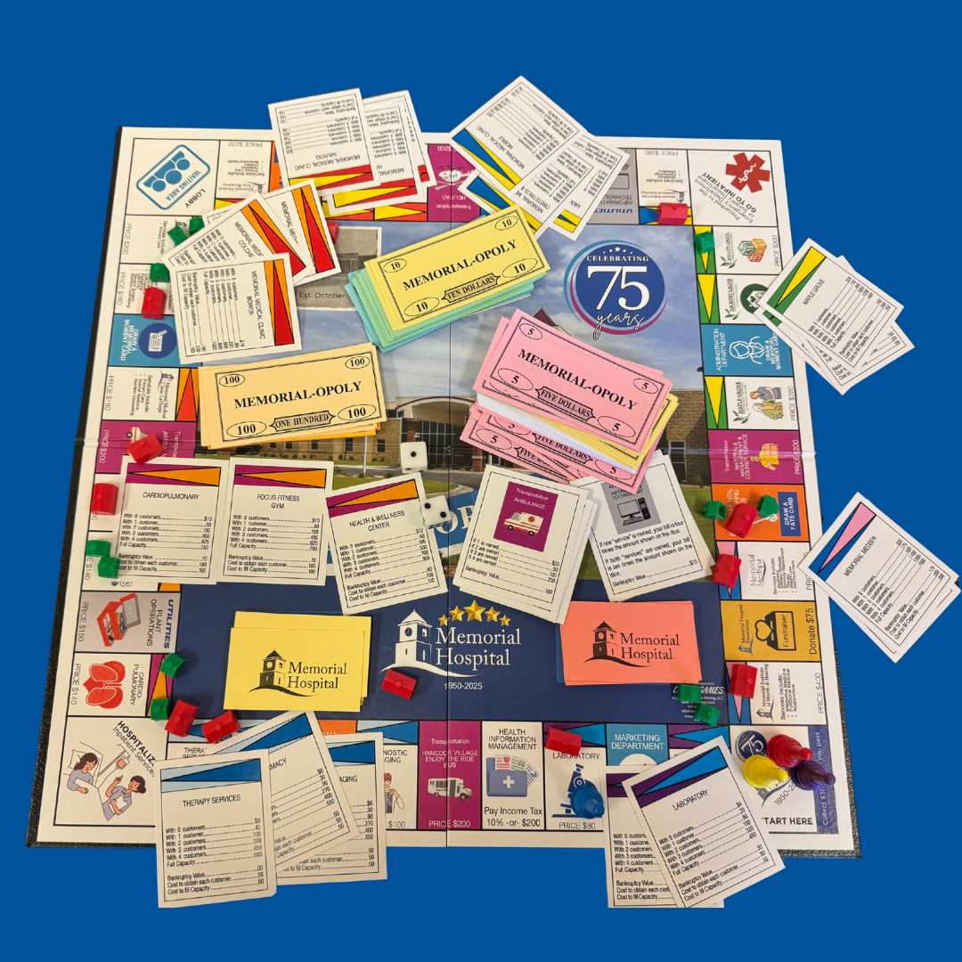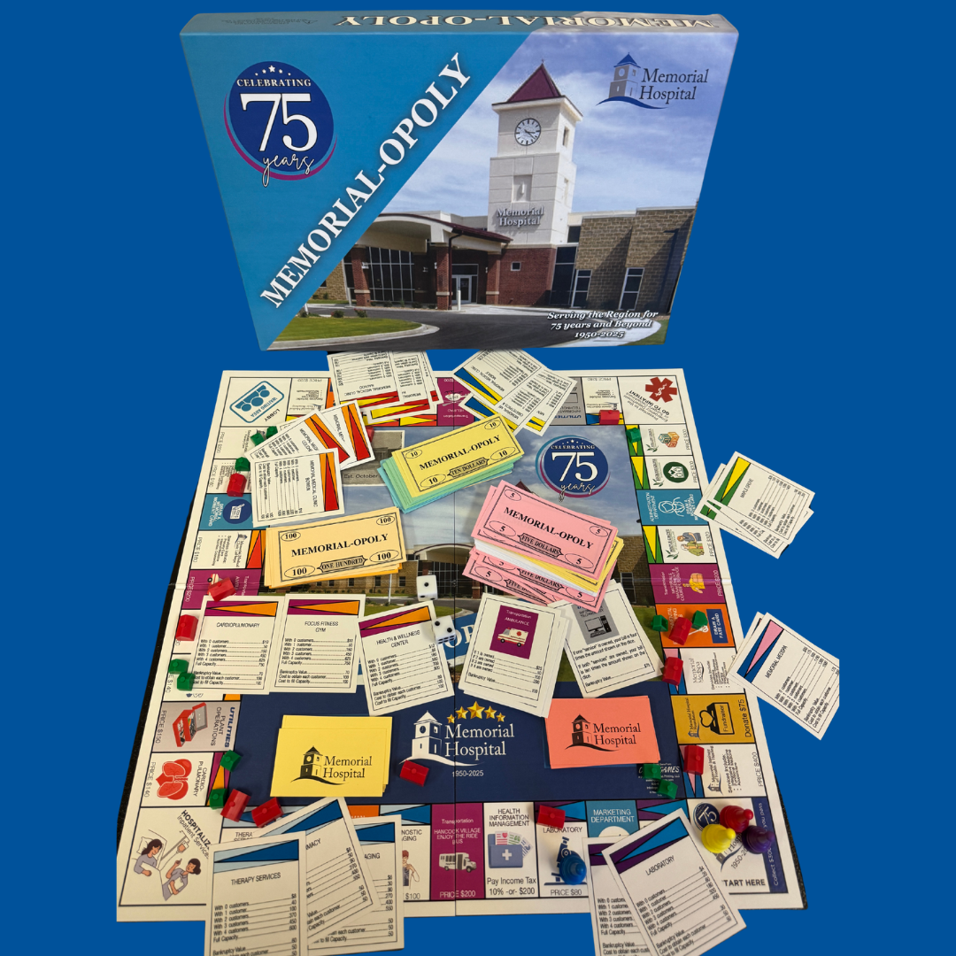 Bring home a piece of Memorial history with Memorial-Opoly—a special twist on the classic Monopoly board game! Featuring Memorial Hospital, Memorial Medical Clinics, Hickory, Maple, and Willow Grove, as well as all our departments, this limited-edition game is a fun way to celebrate and support our mission. Perfect for family game nights, gifts, or collectors, Memorial-Opoly is available now for purchase! You can order online (pre-pay) or visit the hospital gift shop. If you order online, the item must be picked up in person*