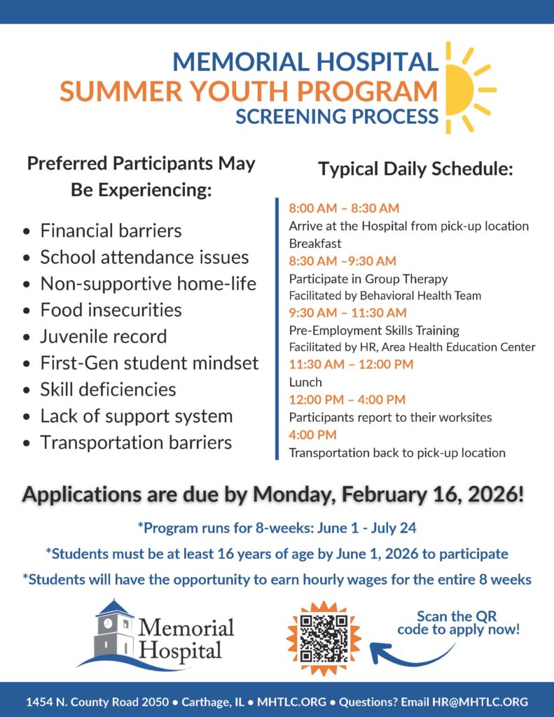 The Summer Youth Program at Memorial Hospital offers high school students an opportunity to explore healthcare careers while gaining valuable work experience, life skills, and mentorship. Over eight weeks, participants take part in group sessions focused on personal growth, communication, and professional development—then apply what they learn through hands-on roles in hospital departments such as Nursing, Radiology, Human Resources, and more.